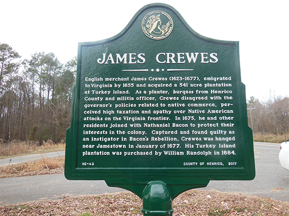 In addition to becoming an affluent planter, enabling him to commute between Virginia and England (hardly a short flight away!), Daniel was made a member of the House of Burgesses and served as sheriff of nearby Charles City. After earning the rank of captain in the local militia, he was addressed as Captain Llewellyn. Granted he bore no lofty title like his father, but he had something far better – a solid financial portfolio! When Daniel died in 1663, he left a sizable estate to his wife Anne and their three children. One of their two daughters, Margaret, married James Crewes, another immigrant and neighboring planter with 451 acres on Turkey Island. Crewes was famously fiery and, in 1676, allied himself with fellow planter Nathaniel Bacon in opposing tyrannical colonial governor William Berkeley who, among other complaints, failed to protect colonists from the ever-present Indian threat and gave preferential treatment to his political toadies. The infamous 1676 incident, known as Bacon’s Rebellion, pitted frontiersmen, planters and common citizenry against the British army and is considered by many historians and President Thomas Jefferson (another character in Defamed) to be the first armed uprising in the American colonies. The rebels drove Berkeley from Virginia and burned Jamestown, the capital, to the ground, but were ultimately defeated by superior British forces. Crewes was one of 23 men tried and convicted of treason, and on January 26, 1677, he was hanged.