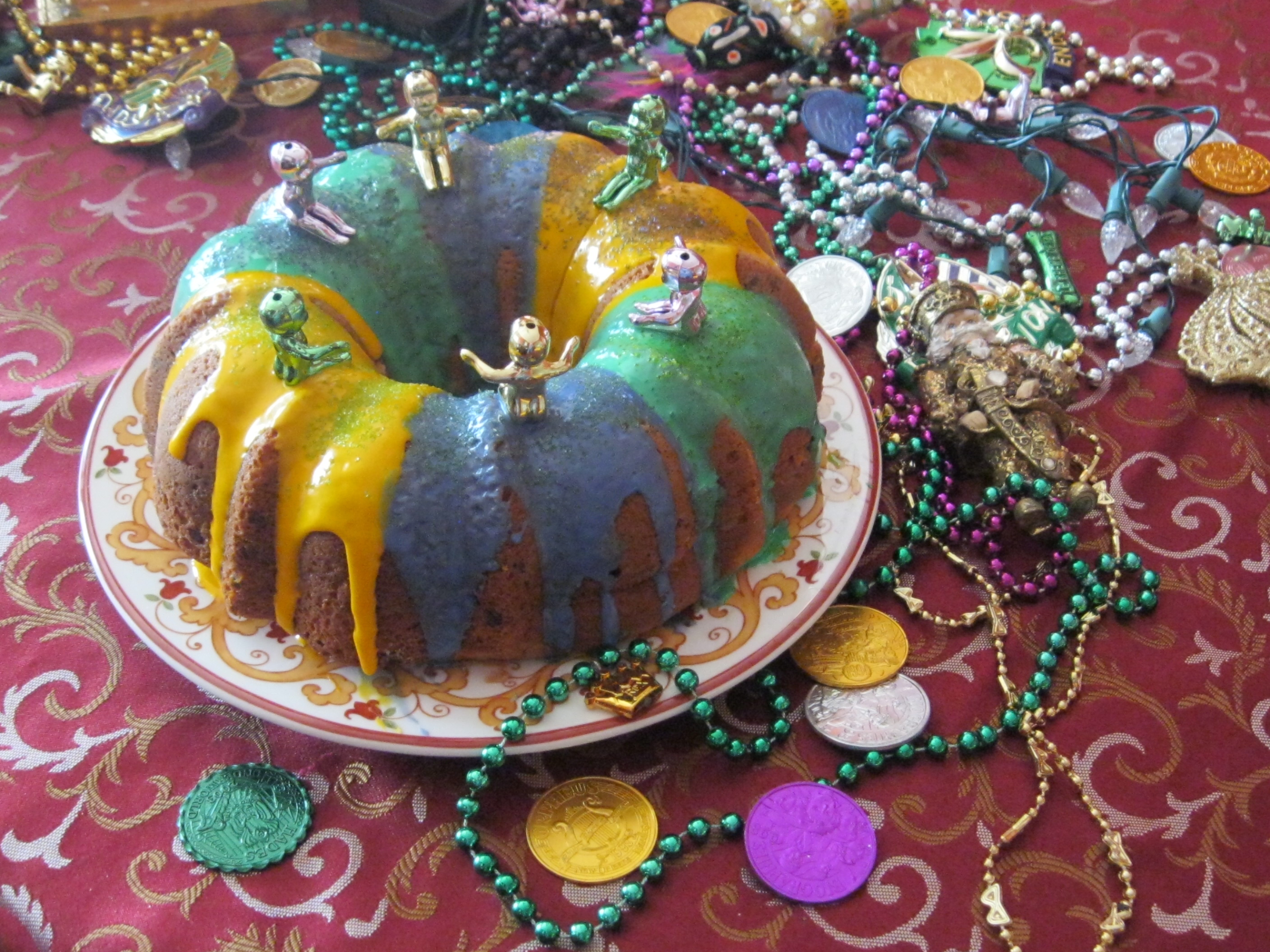 To paraphrase the famous song, I do know what it means to miss New Orleans, and after twelve years of parties I’d finally stashed enough carnival memories. I’ve always believed the best way to continue tradition is to pass it along, so this past Saturday I lowered my carnival flag, turned off the Mardi Gras tree lights for the last time, and bequeathed all my decorations to close friends eager to party on. Thanks to them, the good times will continue to roll, and next year I get to look for the baby Jesus instead of baking it in a cake. It’s the best of both worlds!